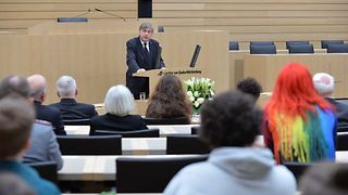 „Gedenken hilft uns, Zusammenhänge zwischen gruppenbezogener Menschenfeindlichkeit heute und unserer Vergangenheit zu erkennen. Es motiviert uns, Angriffen gegen Menschenwürde und Menschenrechte mutig entgegenzutreten“, sagt Landtagspräsidentin Muhterem Aras bei der zentralen Gedenkfeier für die Opfer des Nationalsozialismus im Haus des Landtags. „Das ist der zeitlose Auftrag und Sinn für Gedenkarbeit", betont sie. Der Fokus des Gedenkens liegt an diesem Freitag, 25. Januar 2019, auf den wegen ihrer sexuellen Orientierung Verfolgten.