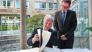 Im Haus der Abgeordneten trägt sich Bernd Busemann (li.) im Beisein von Guido Wolf (re.) in das Gästebuch des Stuttgarter Parlaments ein. Busemann und die weiteren Gäste werden während ihres Besuchs über die Sanierungsarbeiten im Stuttgarter Landtag unterrichtet. Die Arbeiten umfassen sowohl technische als auch energetische Maßnahmen sowie eine Dachöffnung, um den Plenarsaal mit Tageslicht zu versorgen. Ziel der Maßnahmen ist es, das 1961 eingeweihte Gebäude zu modernisieren und es allen geltenden baurechtlichen, technischen und gestalterischen Anforderungen anzupassen.