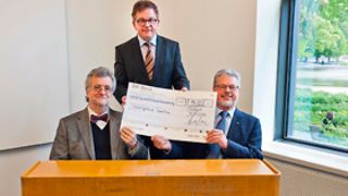 Foto unten: Einen Scheck in Höhe von 14.322 Euro, die im Rahmen der „Verkaufsaktion ausgediente Parlamentsbänke“ zusammenkamen, überreicht Landtagspräsident Guido Wolf (Bildmitte) am Montagmittag, 14. April 2014, an den Geschäftsführer der Nachsorgeklinik Tannheim, Roland Wehrle (rechts). Die Bänke für das Haus der Geschichte nimmt dessen Leiter, Dr. Thomas Schnabel (links), symbolisch entgegen.