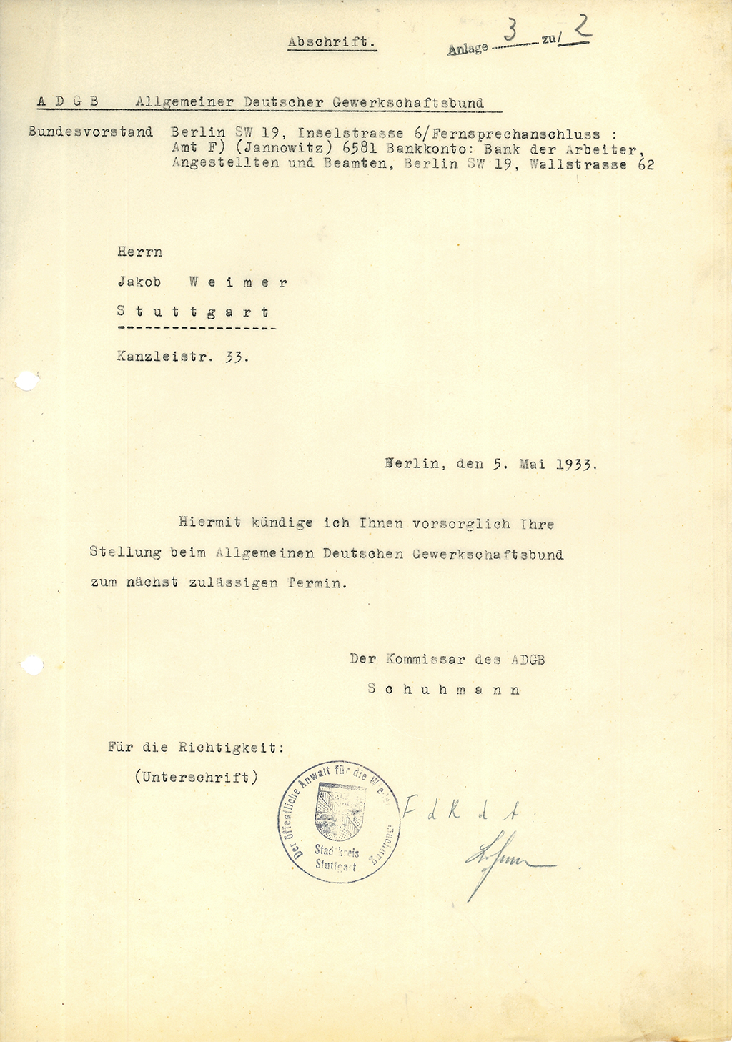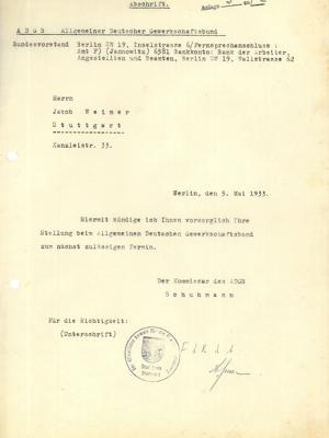 Bezirksleiter des Allgemeinen Deutschen Gewerkschaftsbundes (ADGB) in Stuttgart