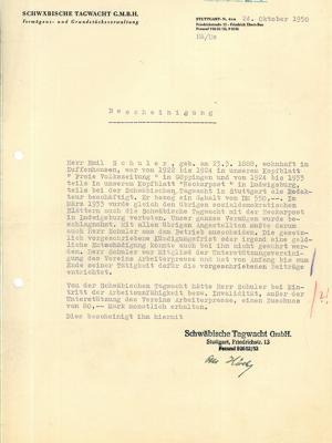 Schuler arbeitet als Redakteur für die SPD-Zeitungen »Neckarpost« in Ludwigsburg und »Schwäbische Tagwacht« in Stuttgart. Im März 1933 werden beide Zeitungen von den NS-Behörden verboten. Schuler verliert im Zuge dessen seine Stelle als Redakteur.