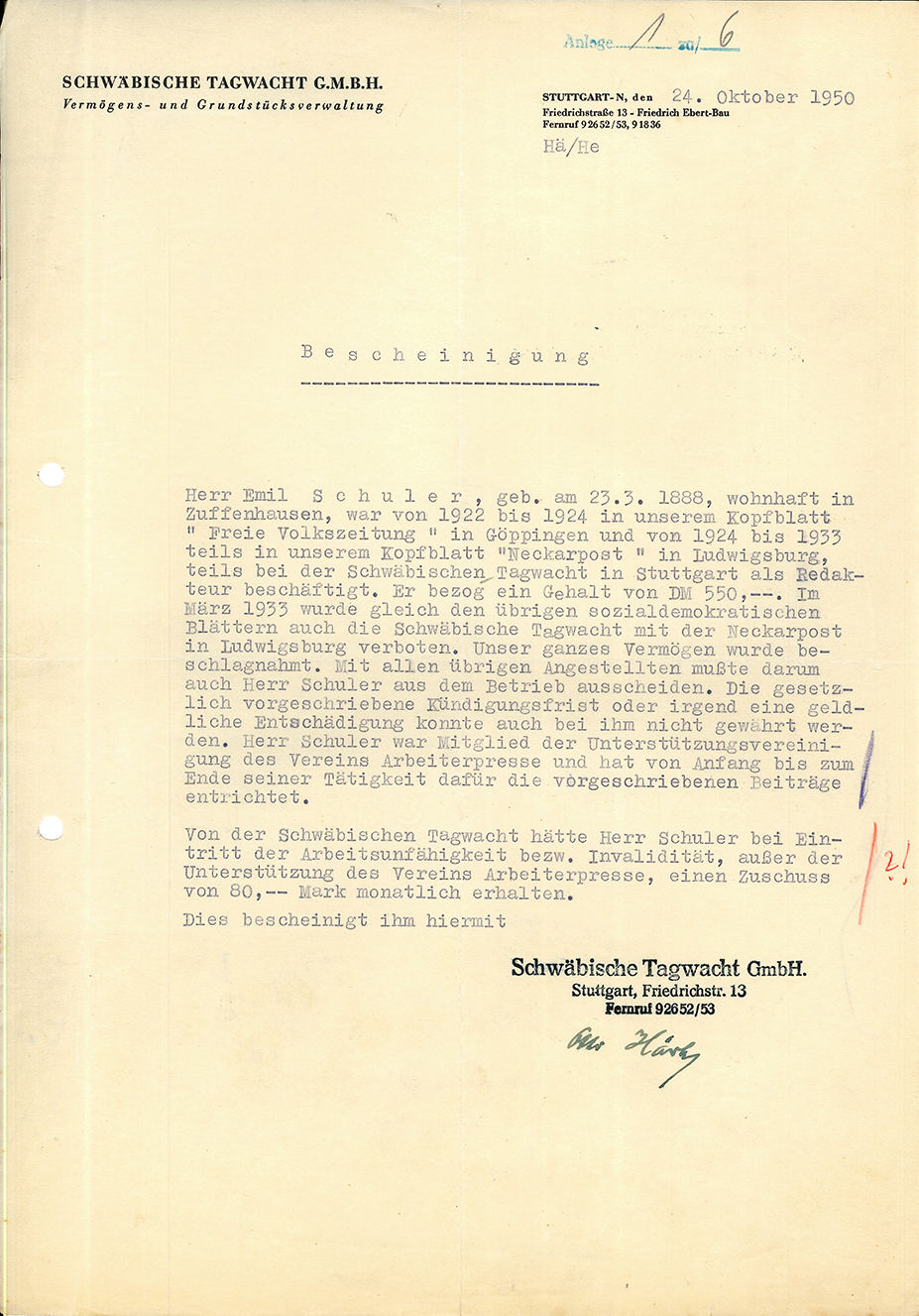Sachbearbeiter bei der Firma Kreidler's Metall- und Drahtwerke in Stuttgart-Zuffenhausen