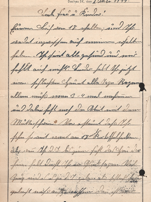Am 2. Juli 1944 schrieb Gäßler aus dem Konzentrationslager Dachau einen Brief an seine Familie. Er äußert sich darin vor allem zu den Arbeiten, die auf dem Bauernhof der Familie anstanden. Die Schwärzungen auf der zweiten Seite des Briefes stammen vermutlich von der Postzensur des Konzentrationslagers. Mutmaßlich ging es dort um Gäßlers Sohn, der Kriegsdienst leistete.