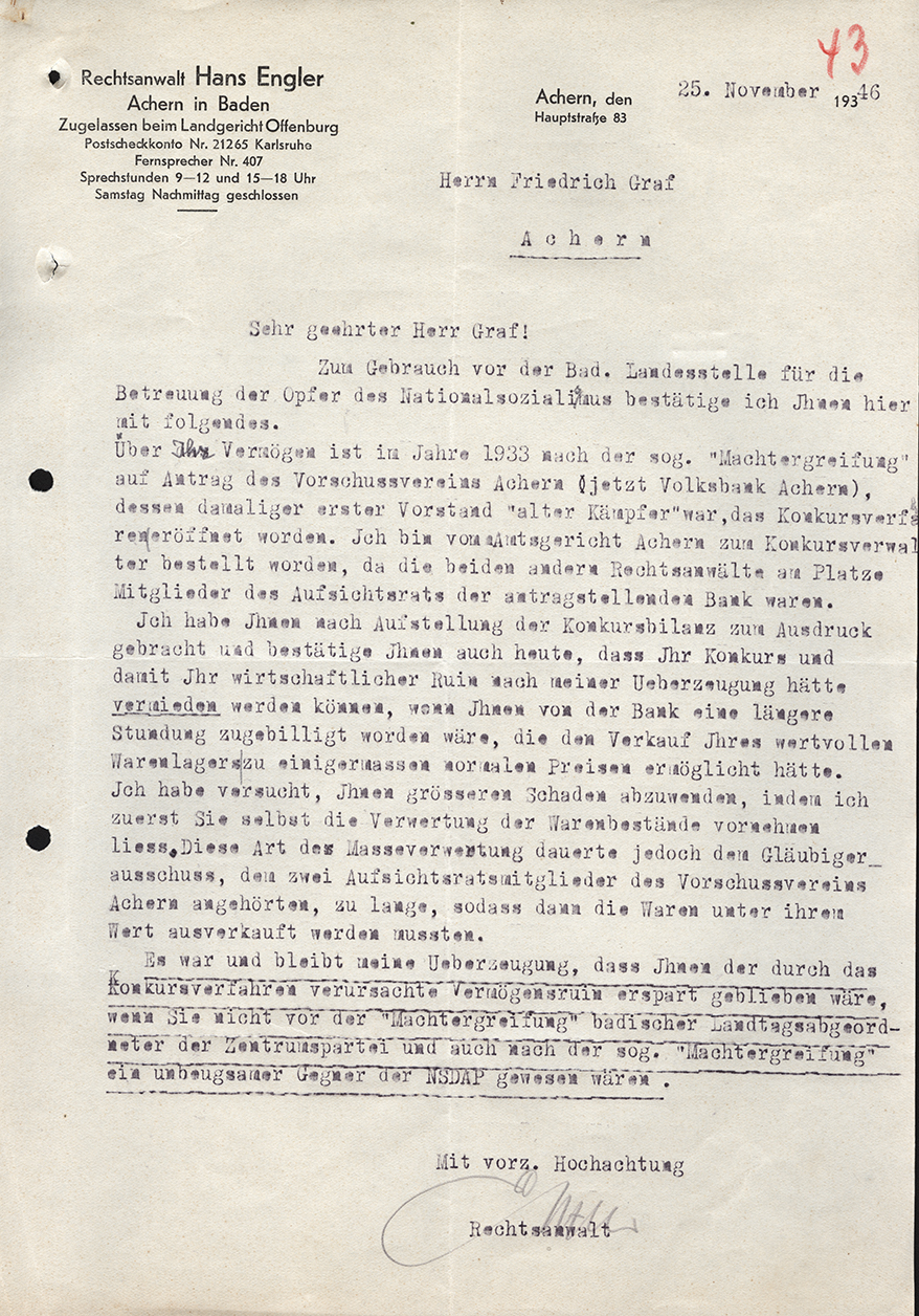 Der Vorschussverein Achern (die spätere Volksbank Achern) verweigerte Graf 1933 eine Stundung seiner Schulden. Grafs Blechnereigeschäft musste in der Folge Konkurs anmelden. 1946 bestätigte der damalige Konkursverwalter, dass das damalige Verhalten des Vorschussvereins seiner Meinung nach politisch motiviert war.