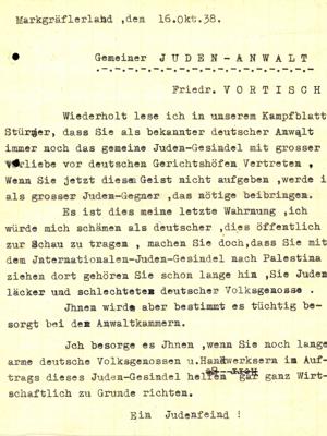 Wegen seiner »politischen Unzuverlässigkeit« verweigern die NS-Behörden Vortisch im Herbst 1940 die Zulassung als Fachanwalt für Steuerrecht.
