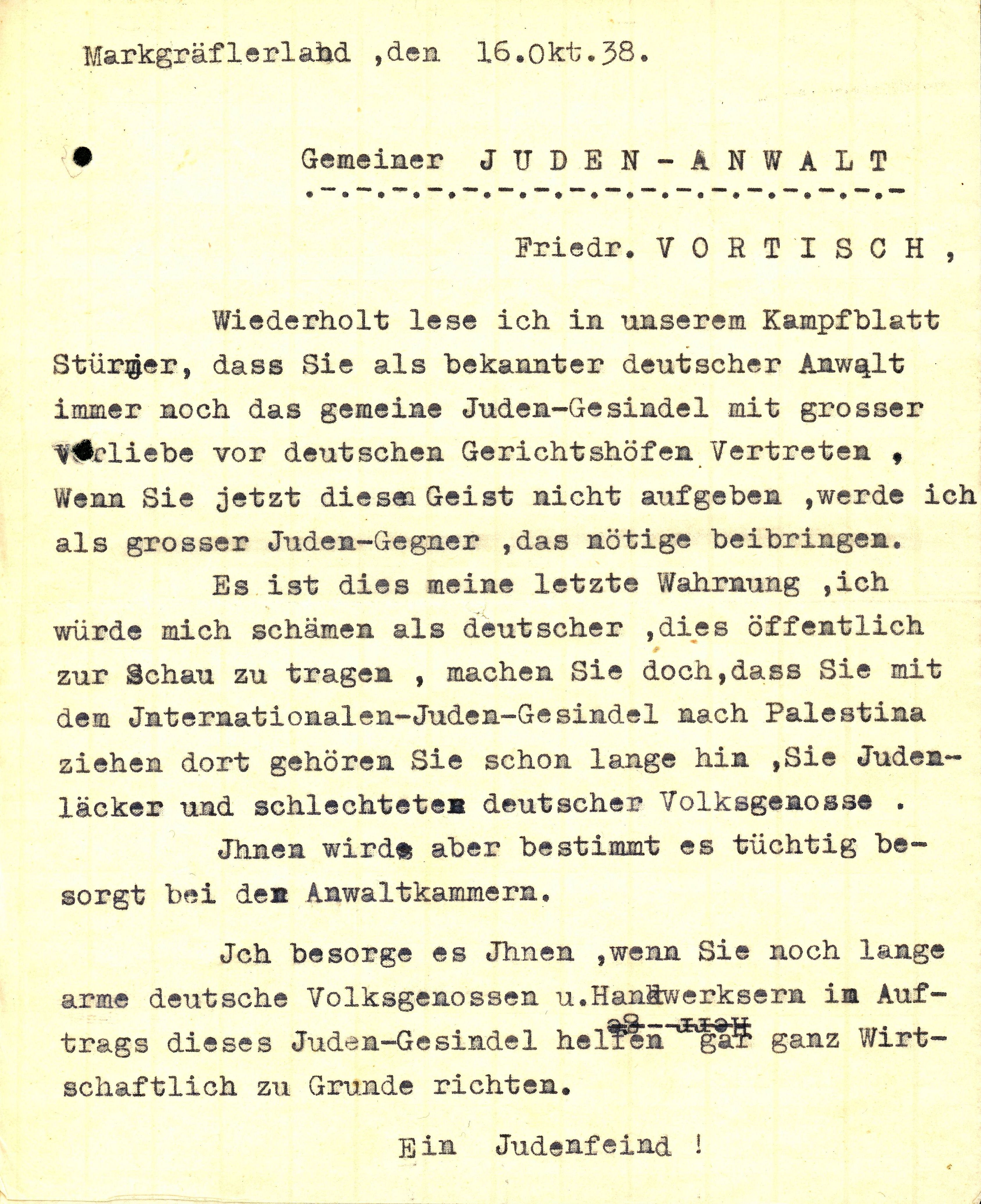 Vortisch ist Rechtsanwalt und vertritt bis 1939 Juden vor Gericht. Er wird deshalb wiederholt von der nationalsozialistischen Wochenzeitung »Der Stürmer« diffamiert und erhält Drohbriefe.