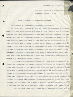 Cahn-Garnier ist Stadtsyndikus in Mannheim. Im Juli 1933 wird er wegen seiner jüdischen Herkunft auf Grundlage des Gesetzes zur Wiederherstellung des Berufsbeamtentums entlassen.