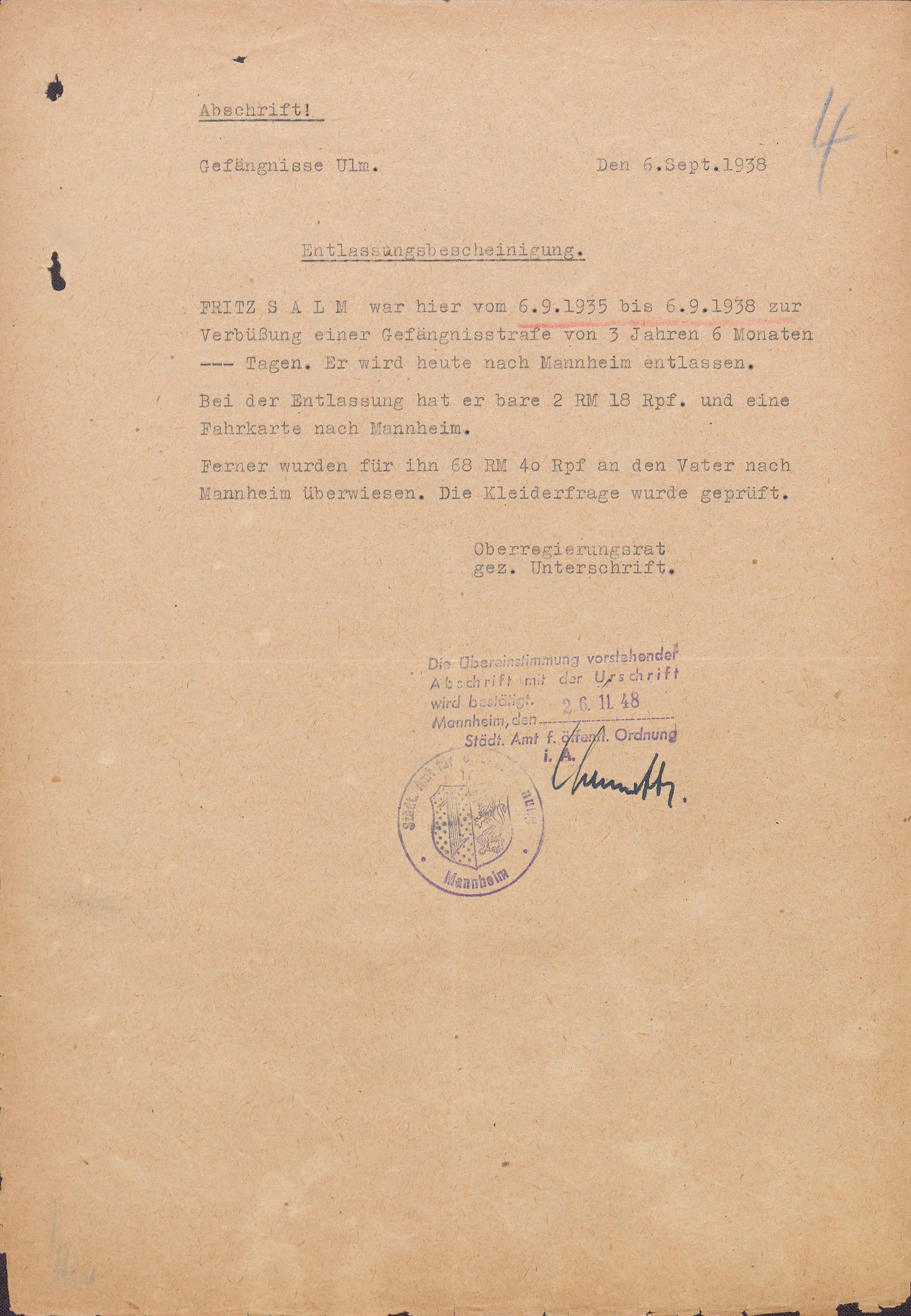 Salm wird am 15. Februar 1935 verhaftet und im Gerichtsgefängnis Mannheim in Untersuchungshaft genommen. Vorgeworfen wird ihm illegale Tätigkeit für den Kommunistischen Jugendverband Deutschlands (KJVD). Am 31. August 1935 wird Salm in das Gefängnis in Karlsruhe überstellt. Ab dem 6. September 1935 befindet er sich im Gefängnis in Mannheim. Das Oberlandesgericht Karlsruhe verurteilt Salm am 6. September 1935 wegen Vorbereitung zum Hochverrat zu drei Jahren und sechs Monaten Haft (unter Anrechnung der bereits verbüßten sechs Monate Untersuchungshaft). Am 8. Mai 1936 wird Salm ins Gefängnis in Ulm überstellt. Dort unternimmt er einen Fluchtversuch und kommt anschließend in Einzelhaft, in der er Tüten kleben und Näharbeiten verrichten muss. Am 9. Juni 1938 wird Salm in Ulm aus der Haft entlassen.