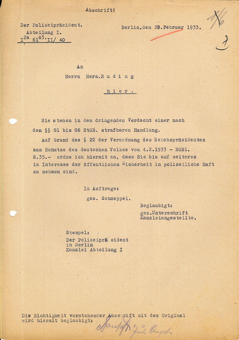 Nuding wird am 28. Februar 1933 anlässlich des Reichstagsbrands in »Schutzhaft« genommen. Zunächst wird er im Polizeipräsidium Berlin, dann im ehemaligen Militärgefängnis Berlin-Spandau inhaftiert. Da Nuding an Tuberkulose erkrankt ist, wird er ins Krankenhaus des Gefängnisses Berlin-Moabit überstellt. Anschließend wird er wieder in das Polizeipräsidium Berlin gebracht und von dort in das Krankenhaus in der Scharnhorststraße in Berlin überstellt. Am 5. Juli 1934 wird Nuding aus der Haft entlassen.