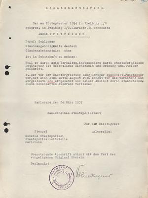 Schutzhaftbefehl gegen Jakob Treffeisen