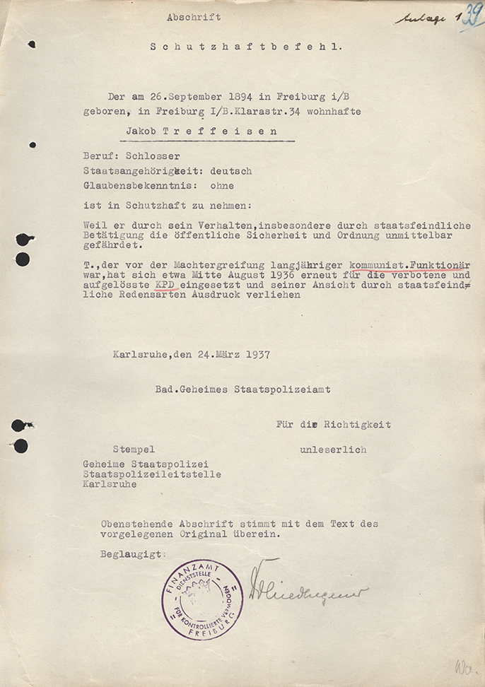 Treffeisen wird im März 1933 verhaftet und in Freiburg in »Schutzhaft« genommen. Am 5. April 1933 wird er aus der Haft entlassen.