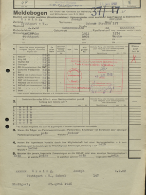Im Rahmen der nach 1945 durchgeführten Entnazifizierung musste Ersing - wie jede und jeder Deutsche über 18 Jahren - in einem Meldebogen seine eventuelle Zugehörigkeit zu NS-Organisationen und seine Aktivitäten in der NS-Zeit darlegen. Ziel dieser Maßnahme war es, NS-Täter und belastete Personen zu finden, aus öffentlichen Ämtern und Behörden zu entfernen und gegebenenfalls zur Rechenschaft zu ziehen.