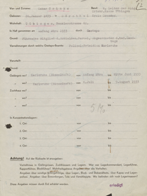 Trinks wird am 18. März 1933 verhaftet und im Gefängnis in Karlsruhe in »Schutzhaft« genommen. Dort wird er am 15. Mai 1933 aus der Haft entlassen.
