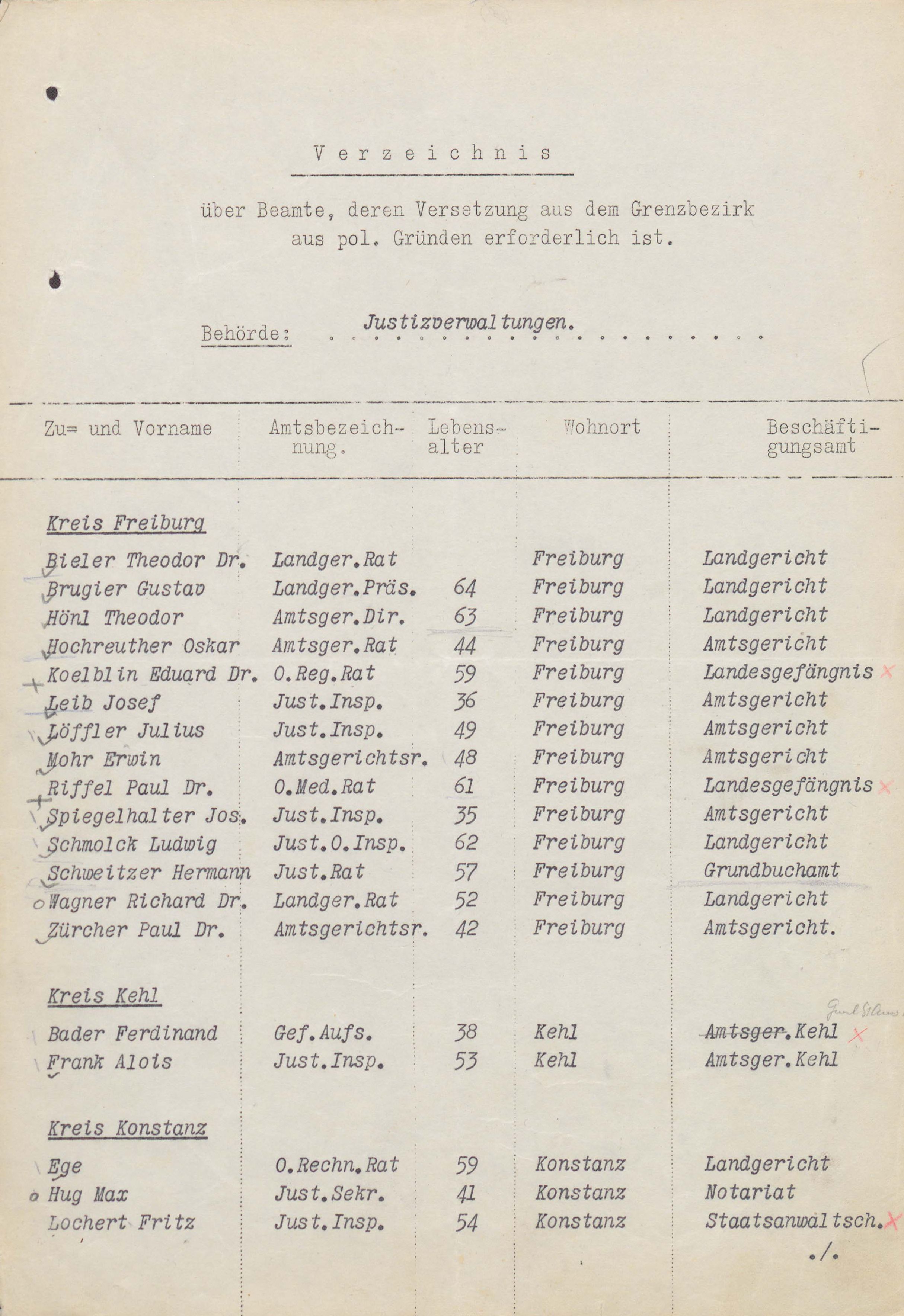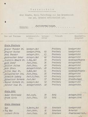 Verzeichnis über Beamte, deren Versetzung aus dem Grenzbezirk aus pol. Gründen erforderlich ist
