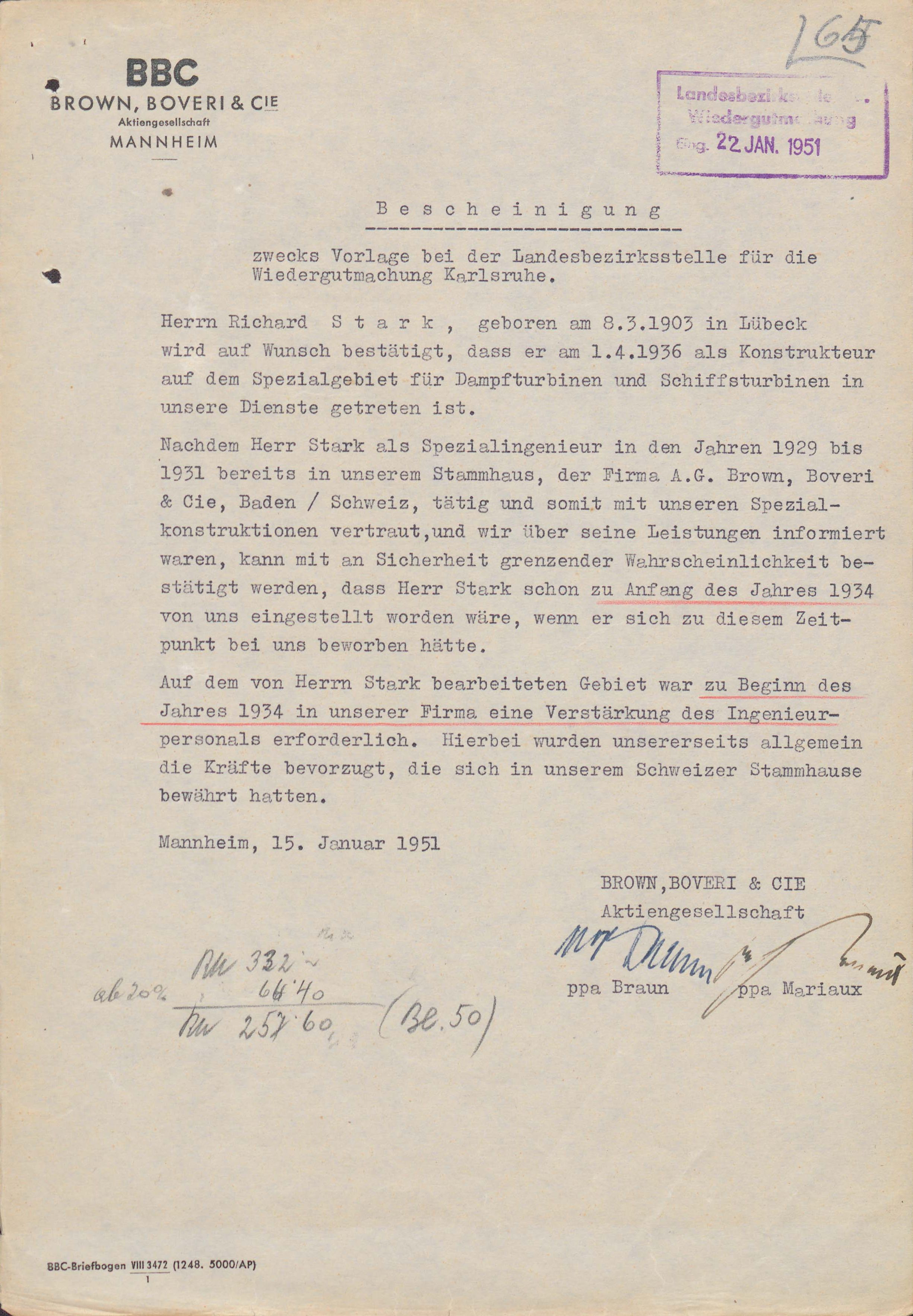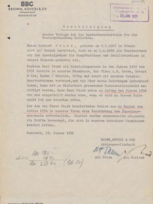 Bescheinigung der Firma Brown, Boveri & Cie (BBC)