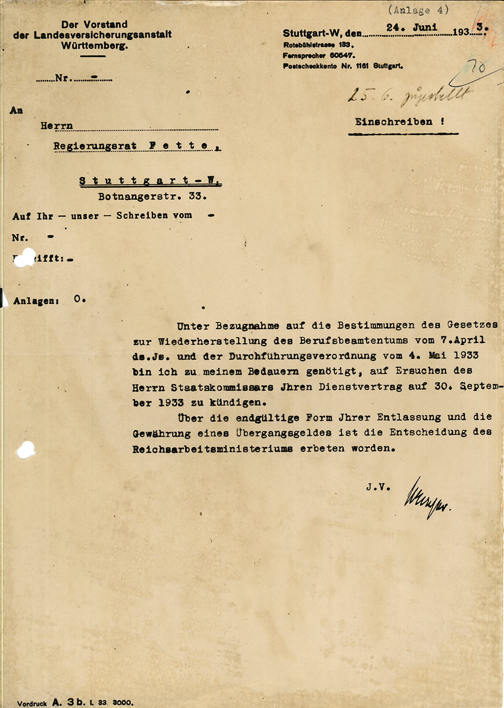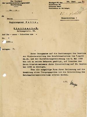 Fette ist Regierungsrat und Vorstandsmitglied der Landesversicherungsanstalt Württemberg. Am 30. März 1933 wird er aus politischen Gründen zunächst beurlaubt und am 24. Juni 1933 zum 30. September 1933 entlassen. Die rechtliche Grundlage dafür bildet das Gesetz zur Wiederherstellung des Berufsbeamtentums.