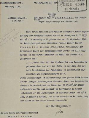 Chemnitz hält sich in der Schweiz auf und spricht vor der KPD-Ortsgruppe Basel. Am 3. März 1933 verhängt die schweizerische Bundesanwaltschaft wegen seiner politischen Betätigung eine Grenzsperre gegen ihn und weist ihn aus.