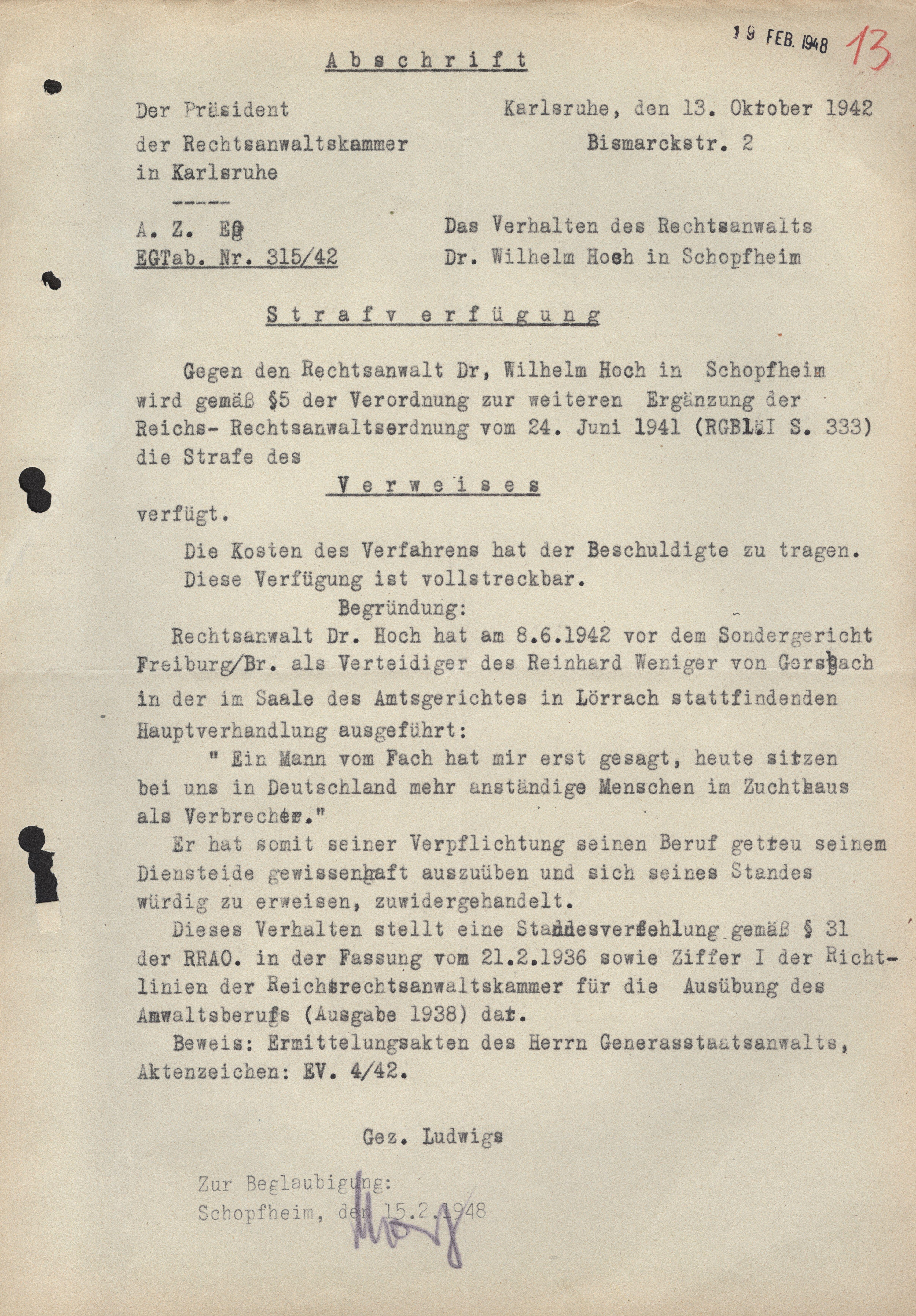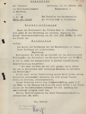 Hoch wird am 11. Juni 1942 durch die Gestapo verhaftet und im Gefängnis Lörrach inhaftiert. Grund dafür ist ein Verstoß gegen das sogenannte Heimtückegesetz (Gesetz gegen heimtückische Angriffe auf Staat und Partei und zum Schutz der Parteiuniformen): Hoch hatte einen Angeklagten wegen eines »Rundfunkverbrechens« bzw. des Hörens ausländischer Radiosender vor dem Sondergericht Freiburg verteidigt. Während seines Plädoyers kritisierte Hoch die NS-Justiz mit den Worten: »Ein Mann vom Fach hat mir erst gesagt, heute sitzen bei uns in Deutschland mehr anständige Menschen im Zuchthaus als Verbrecher.« Am 3. Juli 1942 wird Hoch aus der Haft entlassen. Am 13. Oktober 1942 erhält er wegen des Vorfalls einen Verweis der Rechtsanwaltskammer in Karlsruhe.