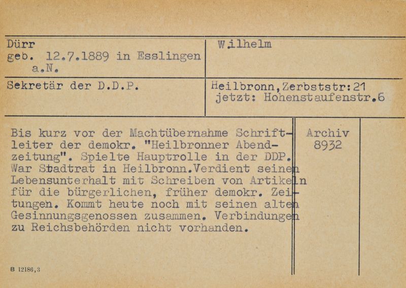 Dürr wird am 30. September 1933 aus politischen Gründen als Redakteur der »Heilbronner Abendzeitung« entlassen.