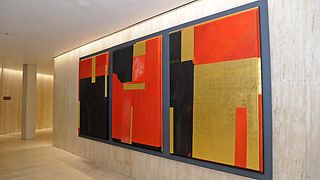 Linker Hand befindet sich das faszinierende Triptychon „Paraphrasen zu den Nationalfarben“ (Bild 2) des namhaften Stuttgarter Künstlers Professor Dr. Otto Herbert Hajek (1927-2005). Bei diesem dreiteiligen Gemälde, einer Dauerleihgabe des Bundes, handelt es sich um eine künstlerische Annäherung an die deutschen Farben Schwarz-Rot-Gold. Das in Gold und in Acrylfarbe gemalte Bild hat eine Höhe von 2,50 m und eine Breite von 5,70 m.