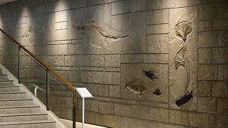 Die bestens erhaltenen Versteinerungen (Bild 3) an der großen Schieferwand rechts im Foyer - angeordnet wurden sie von Professor Baum vom Museum für Naturkunde - stammen aus der Nähe von Holzmaden am Fuß der Schwäbischen Alb. Sie sind mindestens 140 Mio. Jahre alt.