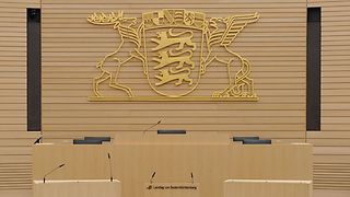 Die Ostwand des neuneckigen Plenarsaals im Hauptgeschoss ziert das von Walter Brudi entworfene und von dem Schwäbisch Gmünder Goldschmied Hermann Stadelmaier gefertigte Große Landeswappen (Bild 5).