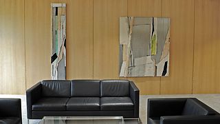 In der Nische neben dem Mosersaal sind die Textilgrafiken von Ingeborg Schäffler-Wolf angebracht: Objekt eins „Textil und Metall doppelt überlagert“ und Objekt zwei „Textil über Metall“ (Bild 7).