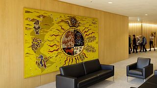 In der Nische neben dem Friedrich-Ebert-Saal hängt der von Alice und Pierre Pauli 1961 nach dem Entwurf des französischen Künstlers Jean Lurçat (1892-1966) gewobene Wandteppich „Apollinaire“ (Bild 8)