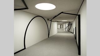 Die 136 m lange unterirdische Verbindung zwischen dem Haus des Landtags und dem Haus der Abgeordneten wird durch die sich schwungvoll entwickelte Raumzeichnung „Stuttgarter Weg“ (Bild 9) von Robert Schad optisch erweitert. Die 1986/87 entstandene Konstruktion besteht aus 4,5 cm starken Vierkantstahlstäben, ausgeformt in Vertikalen, Horizontalen, Stuttgarter Weg Diagonalen und einzelnen Kreissegmenten. Die Prägnanz des Entwurfs von Robert Schad hatte der Jury 1985 sofort eingeleuchtet und einhellige Zustimmung gefunden: „Indem der Betrachter der sehr bewegten, dynamischen Raumlinie folgt, die wie eine großzügige, freie Kalligraphie den Raumschacht umspielt und ihn ebenso attackiert, wird das Zwanghafte der Wegführung ‘überspielt’ und damit humanisiert.“