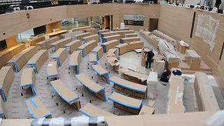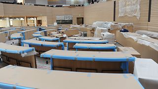 Die Generalsanierung des Landtagsgebäudes ist im April 2016 weiter in vollem Gange. Die neuen Tische an den Abgeordnetenplätzen im Plenarsaal sind eingebaut, wegen der laufenden Baumaßnahmen allerdings noch verpackt. Im Zuge der Sanierung waren die alten Tische und Bänke der Parlamentarier ausgebaut und teilweise für einen guten Zweck verkauft worden.