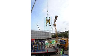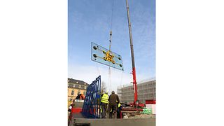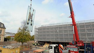 Ein großer Sauger kam zum Einsatz, um die schwere neue Scheibe vom Lastwagen an die richtige Stelle zu bringen.