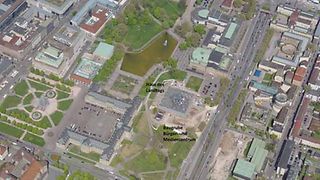 Blick von oben auf die Bauarbeiten am Haus des Landtags und die Baugrube für das künftige Bürger- und Medienzentrum.