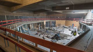 Die Generalsanierung des Landtagsgebäude ist voll im Gange. Auch im Plenarsaal kommen die Arbeiten gut voran: Der Saal wurde in den Rohbauzustand zurückversetzt und temporäre Stützpfeiler wurden installiert. Zwar fällt nun schon erstes Tageslicht in den Plenarsaal (siehe Foto), allerdings nicht aufgrund der geplanten Lichtkegel. Für das Licht sorgt vielmehr eine Dachlücke, durch die Baumaterial angeliefert werden kann.