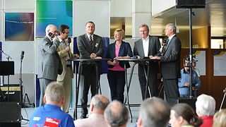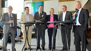 <span style="font-family: Arial, Helvetica, sans-serif; line-height: 18.171875px;">Befragt von Jürgen Schmitz (links) und Dieter Fritz (rechts, beide SWR) nehmen die Fraktionsvorsitzenden Peter Hauk (CDU), Dr. Hans-Ulrich Rülke (FDP/DVP), Edith Sitzmann (Grüne) und Claus Schmiedel (SPD) zu landespolitischen Fragen und Schwerpunkten Stellung (v.l.n.r.).</span>