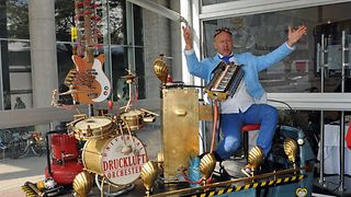 Das Universal Druckluft Orchester spielt vor dem Eingang des Landtagszelts auf
