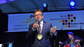 "Das Bürgerfest macht die Freude der Deutschen an der Wiedervereinigung multimedial erlebbar", sagt Landtagspräsident Guido Wolf in seiner Eröffnungsrede im Landtagszelt