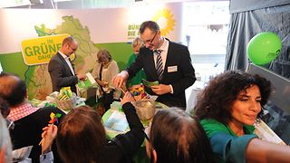 Die vier Landtagsfraktionen präsentieren sich im Landtagszelt: Hier der Stand der Grünen