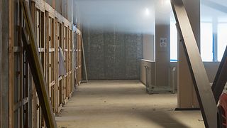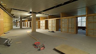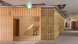 Die Unterkonstruktionen der denkmalgeschützten Holzwandverkleidungen verbleiben auch während der Rohbauarbeiten im Gebäude.<br />