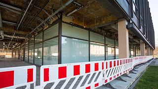 Bis zur Erstellung des umlaufenden Bauzauns schützten temporäre Absperrvorrichtungen die Baustelle vor unbefugtem Betreten.<br />