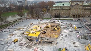 Die Rohbauarbeiten für das künftige unterirdische Technikbauwerk haben begonnen. Außerdem wurde ein Kran aufgebaut, der unter anderem durch eine Öffnung im Dach die Baustelle mit Material beliefert.<br />
