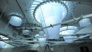 Die Lichttrichter und -kegel, über die der Plenarsaal künftig mit Tageslicht versorgt wird, sind eingebaut. <br />