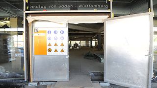 Am Eingang des Landtagsgebäudes ist gut zu erkennen, dass die Sanierungsarbeiten noch voll im Gange sind.<br />