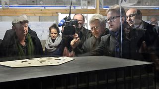 Landtagspräsident Guido Wolf (2.v.re.) erklärt an einem Modell das Aussehen des künftigen Plenarsaals.<br />
