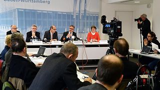 Informieren Medienvertreter über den Stand der Sanierungsmaßnahmen: Landtagspräsident Guido Wolf (2.v.re.), der Leiter der Abteilung "Vermögen und Hochbau" des Finanz- und Wirtschaftsministeriums, Rolf Sutter (3.v.li.), und der Leiter des Amtes Stuttgart des Landesbetriebs Vermögen und Bau, Roland Wenk (2.v.li.).<br />