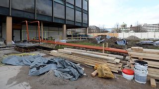 Für Abdichtungs- und Dämmzwecke sowie zur Verlegung neuer Leitungen werden Erdarbeiten um das Landtagsgebäude durchgeführt.<br />