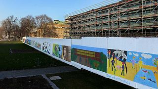 Schülerinnen und Schüler aus Baden-Württemberg haben den Bauzaun verschönert, der das Landtagsgebäude während der Sanierungsarbeiten vor unbefugtem Betreten schützt.<br />