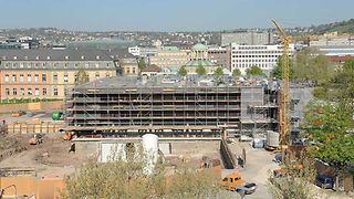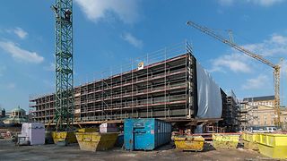 Bei einem Blick hinter den Bauzaun wird deutlich, dass die Arbeiten am Landtagsgebäude voll im Gange sind.<br />