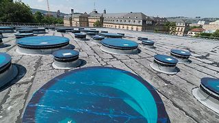 In das Dach wurden kreisförmige Öffnungen eingebracht, damit künftig durch Lichttrichter und -kegel Tageslicht in den Plenarsaal strömen kann.<br />