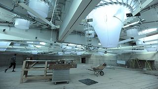 Um an der Innenseite des Dachs über dem Plenarsaal arbeiten zu können, wurde ein Zwischenboden aus Holz errichtet.<br />