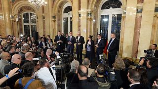 Kurz nach den ersten Hochrechnungen: Großer Medienandrang bei der Pressekonferenz mit den Spitzenkandidaten der Parteien. Auf dem Podium (v.li.n.re.): Dr. Hans-Ulrich-Rülke (FDP), Dr. Nils Schmid (SPD), Ministerpräsident Winfried Kretschmann (Grüne), Moderatorin Gabriele Renz (LPK-Vorsitzende), Guido Wolf (CDU) und Prof. Dr. Jörg Meuthen (AfD).